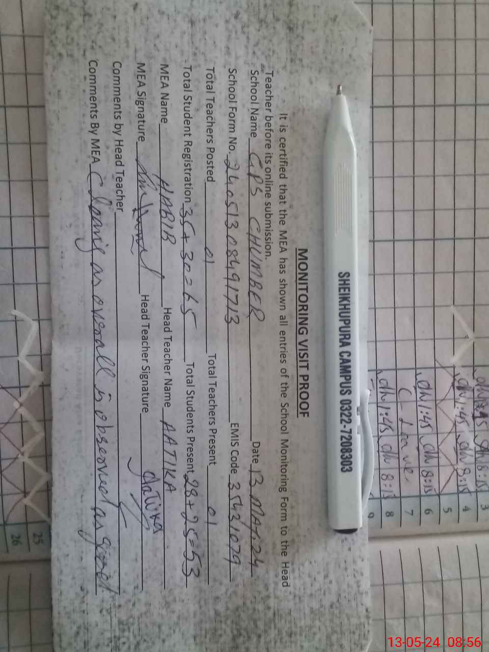 | Attendance Register | Head Teacher | MEA with School | Visit Proof |