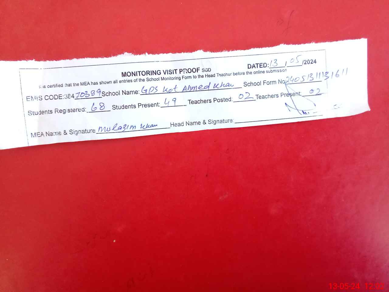 | Attendance Register | Head Teacher | MEA with School | Visit Proof |