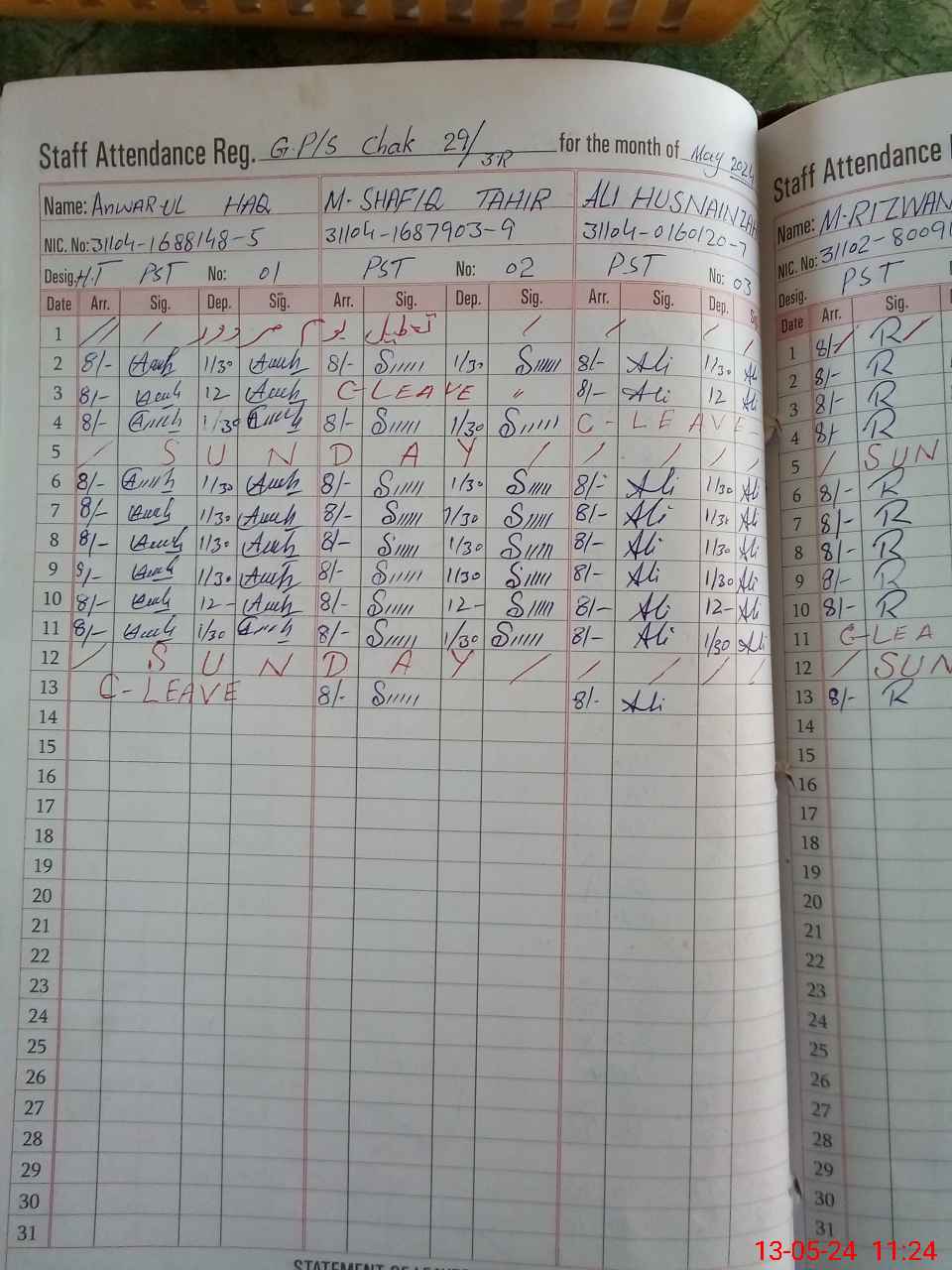 | CNIC | Full Name | Designation | R/C | Absence During Last Calender Month |