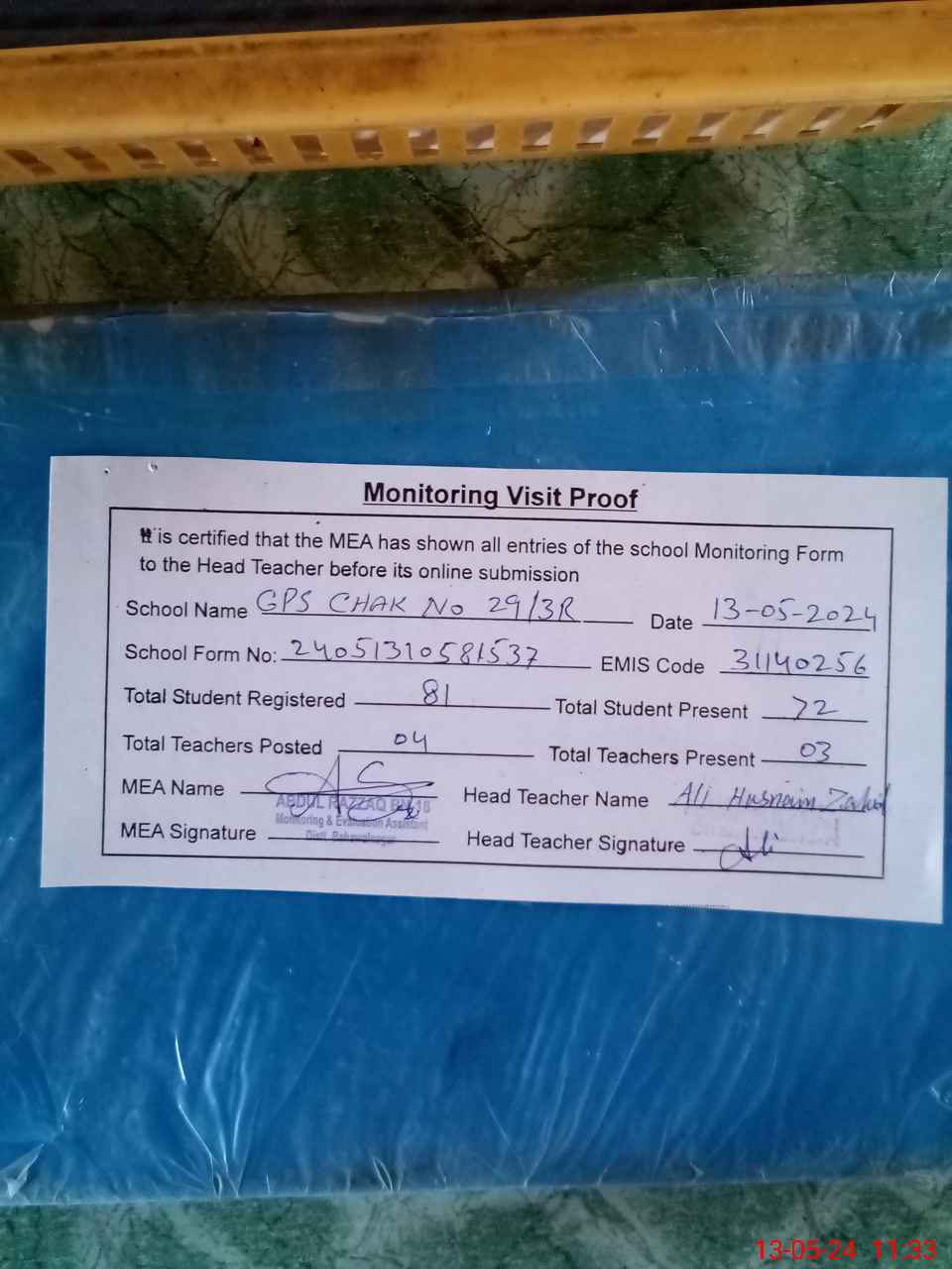 | Attendance Register | Head Teacher | MEA with School | Visit Proof |