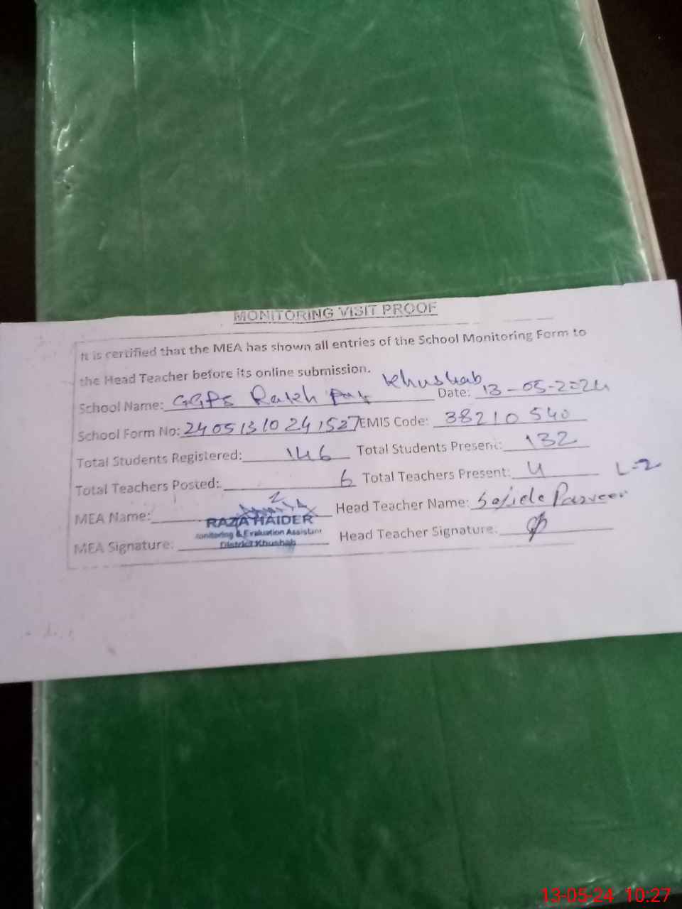 | Attendance Register | Head Teacher | MEA with School | Visit Proof |