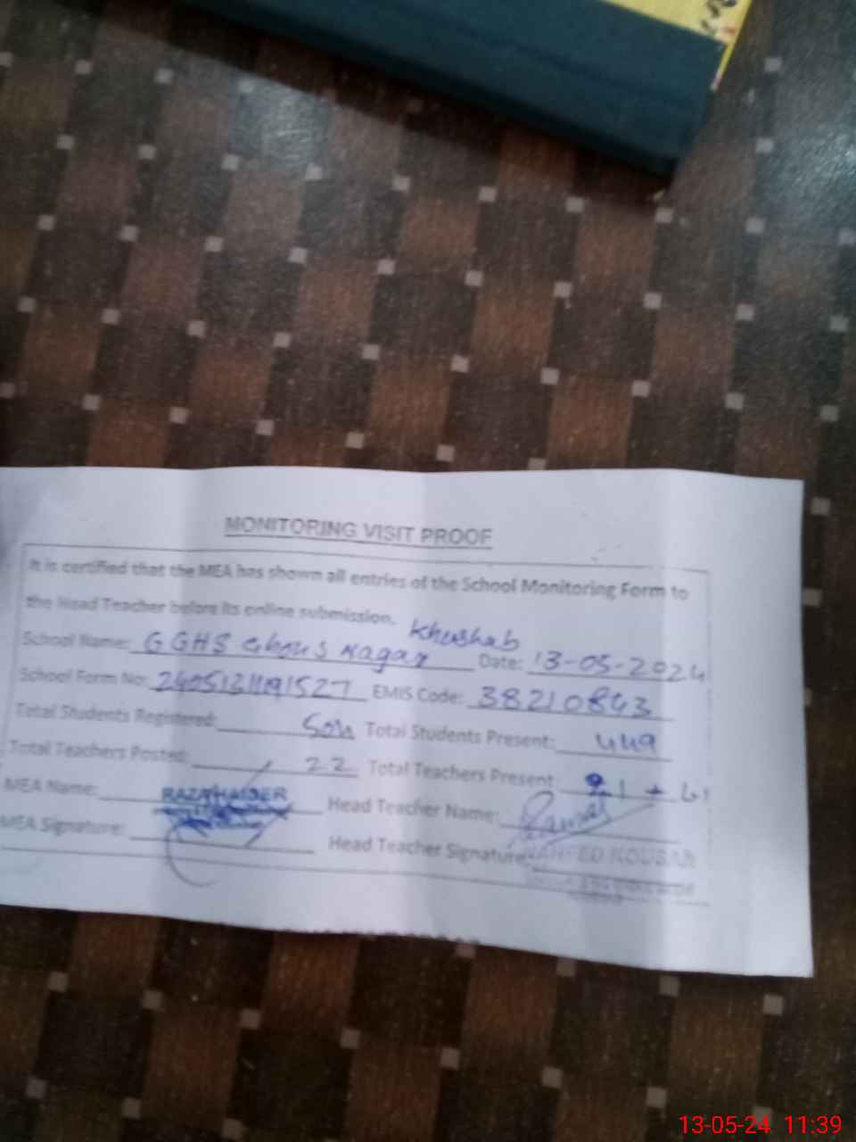 | Attendance Register | Head Teacher | MEA with School | Visit Proof |