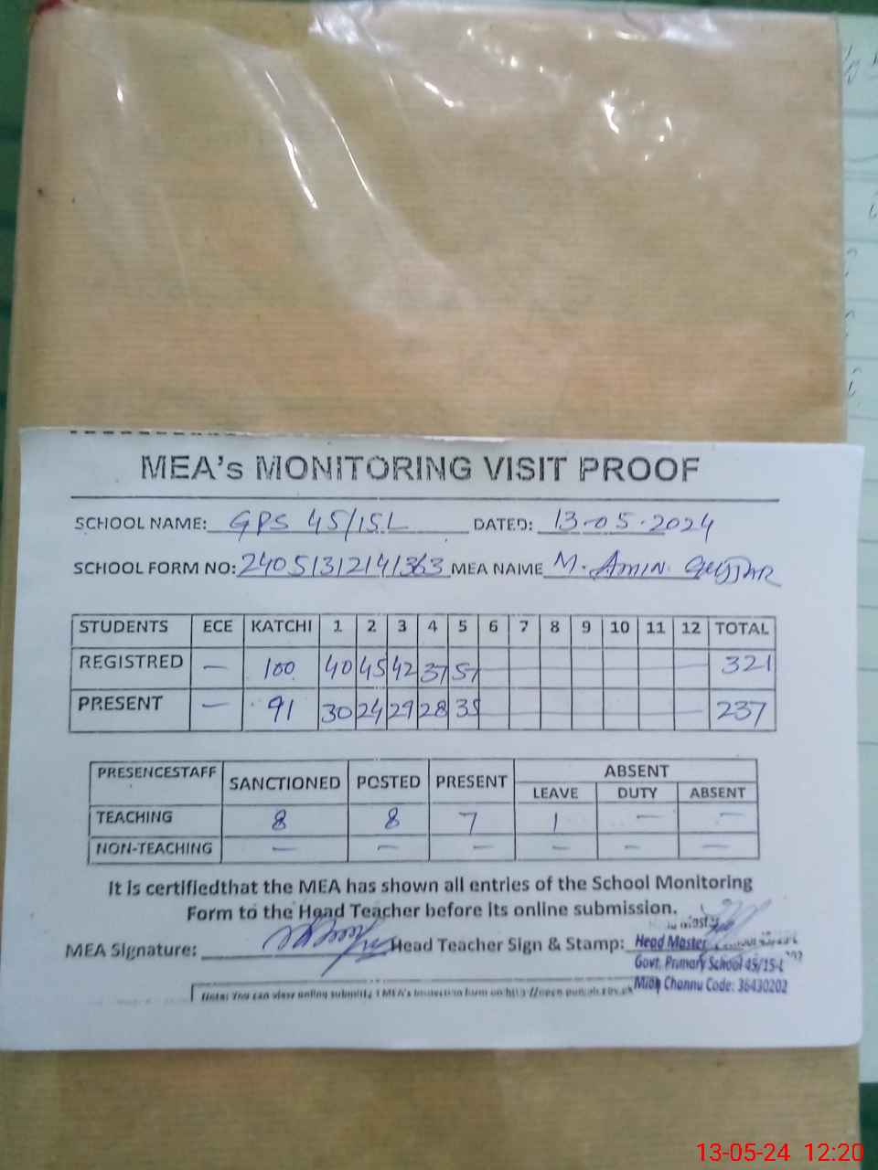 | Attendance Register | Head Teacher | MEA with School | Visit Proof |