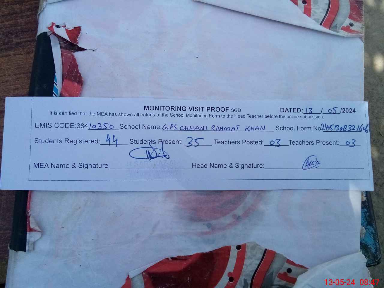 | EMIS Code: 38410350 | Name of School: GPS CHHANI RAHMAT KHAN | |||