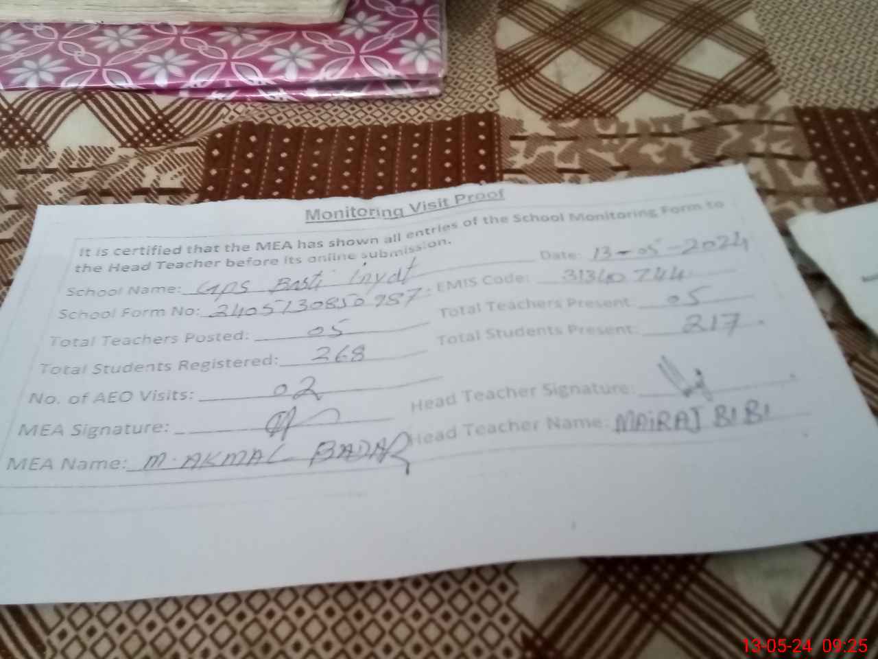| Attendance Register | Head Teacher | MEA with School | Visit Proof |