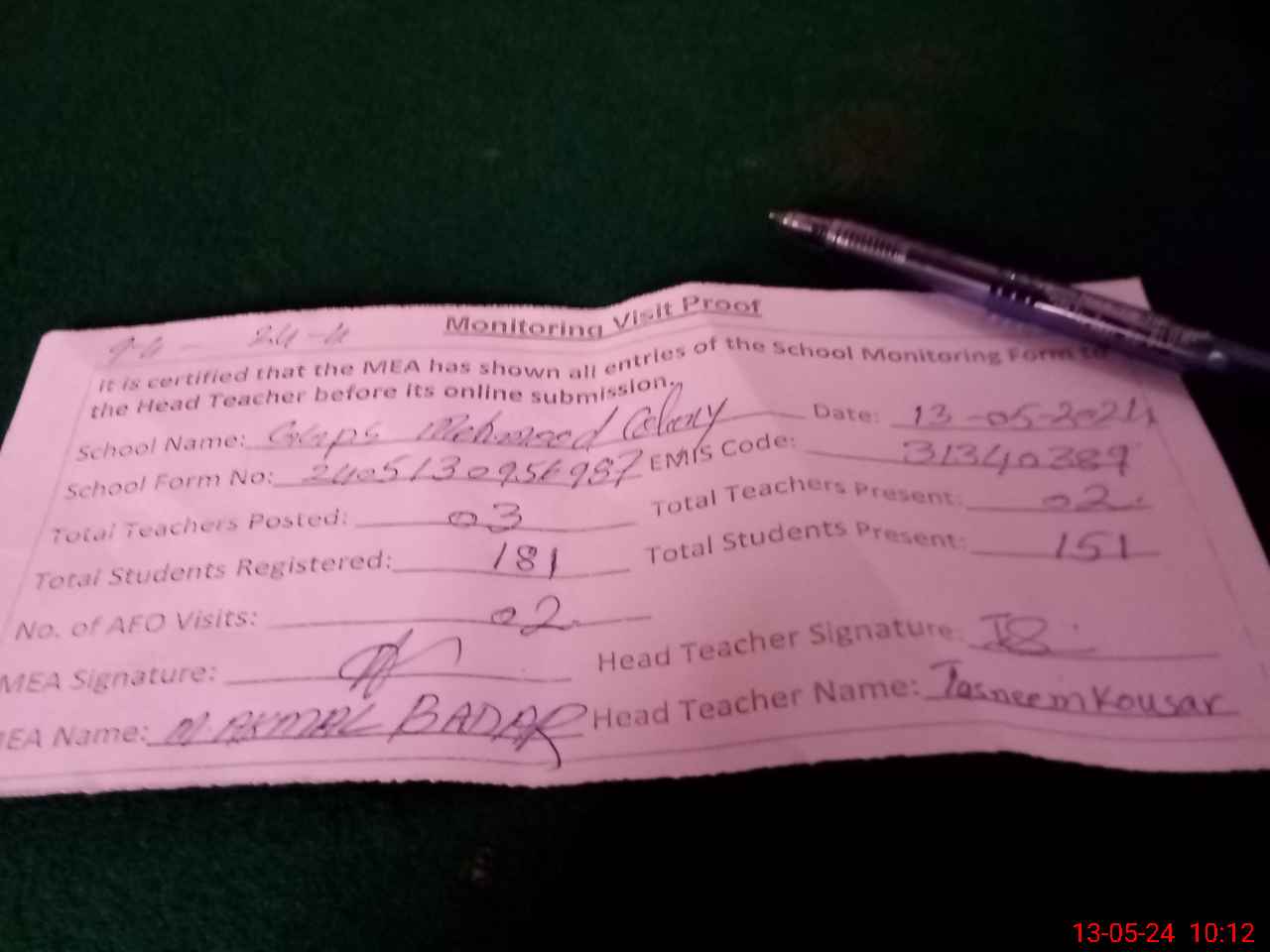 | Certified that this School was Inspected by the Undersigned MEA/DMO Today and the Information Stated Above is as Per Record. | |||||