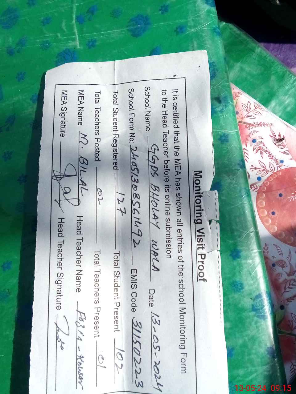 | Attendance Register | Head Teacher | MEA with School | Visit Proof |