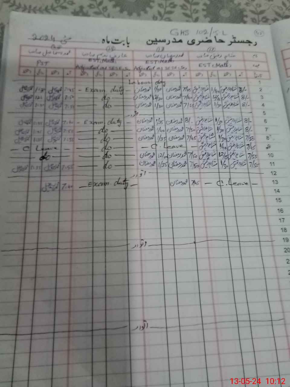 | 36**** | Ar**** Na**** | 1 | 1 | 20 | 0 | 0 | 0 | 0 | 0 | 0 | 1 | Exam Duty | |