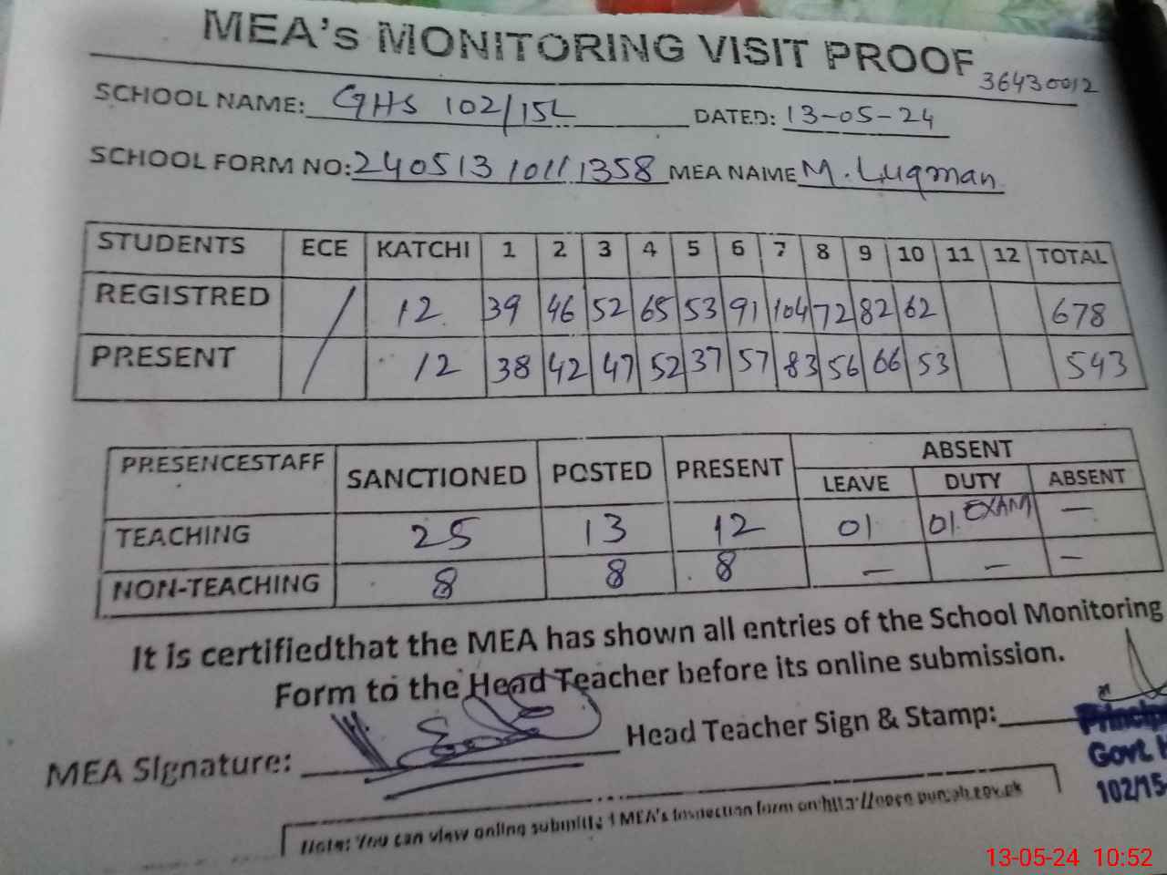 | Attendance Register | Head Teacher | MEA with School | Visit Proof |