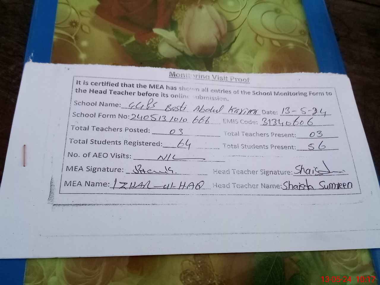 | EMIS Code: 31340606 | Name of School: GGPS ABDUL KARIM | |||