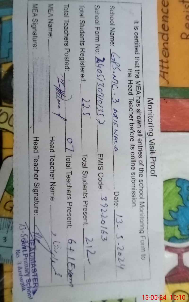 | EMIS Code: 39220163 | Name of School: GPS NO. 3 ARIFWALA | |||