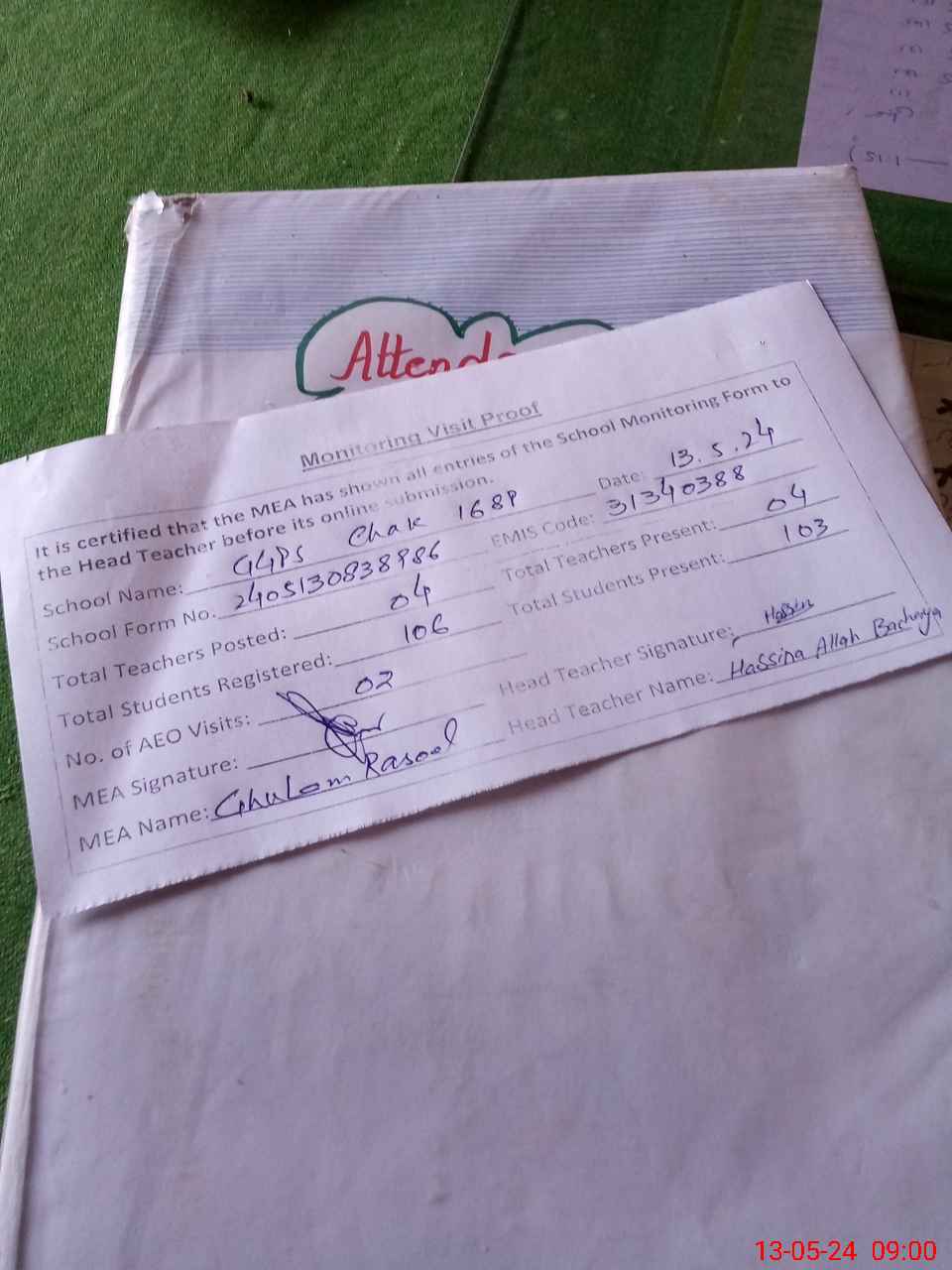 | Attendance Register | Head Teacher | MEA with School | Visit Proof |