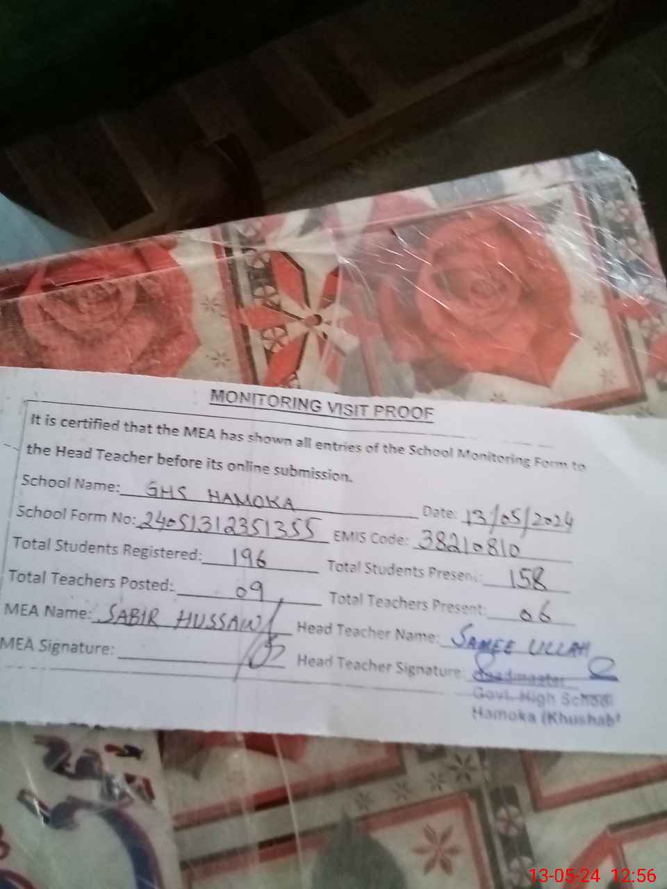 | Certified that this School was Inspected by the Undersigned MEA/DMO Today and the Information Stated Above is as Per Record. | |||||
