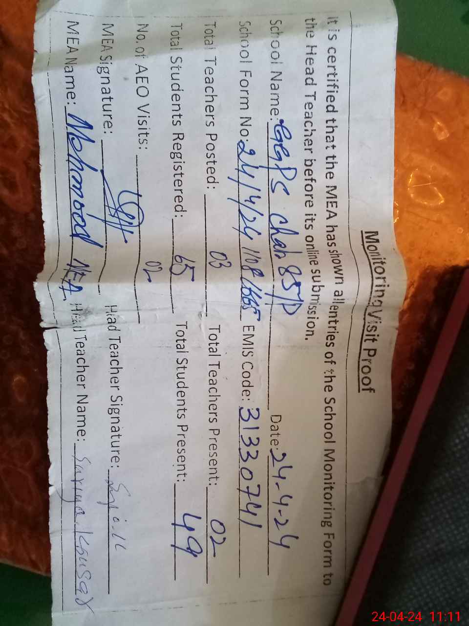 | Attendance Register | Head Teacher | MEA with School | Visit Proof |