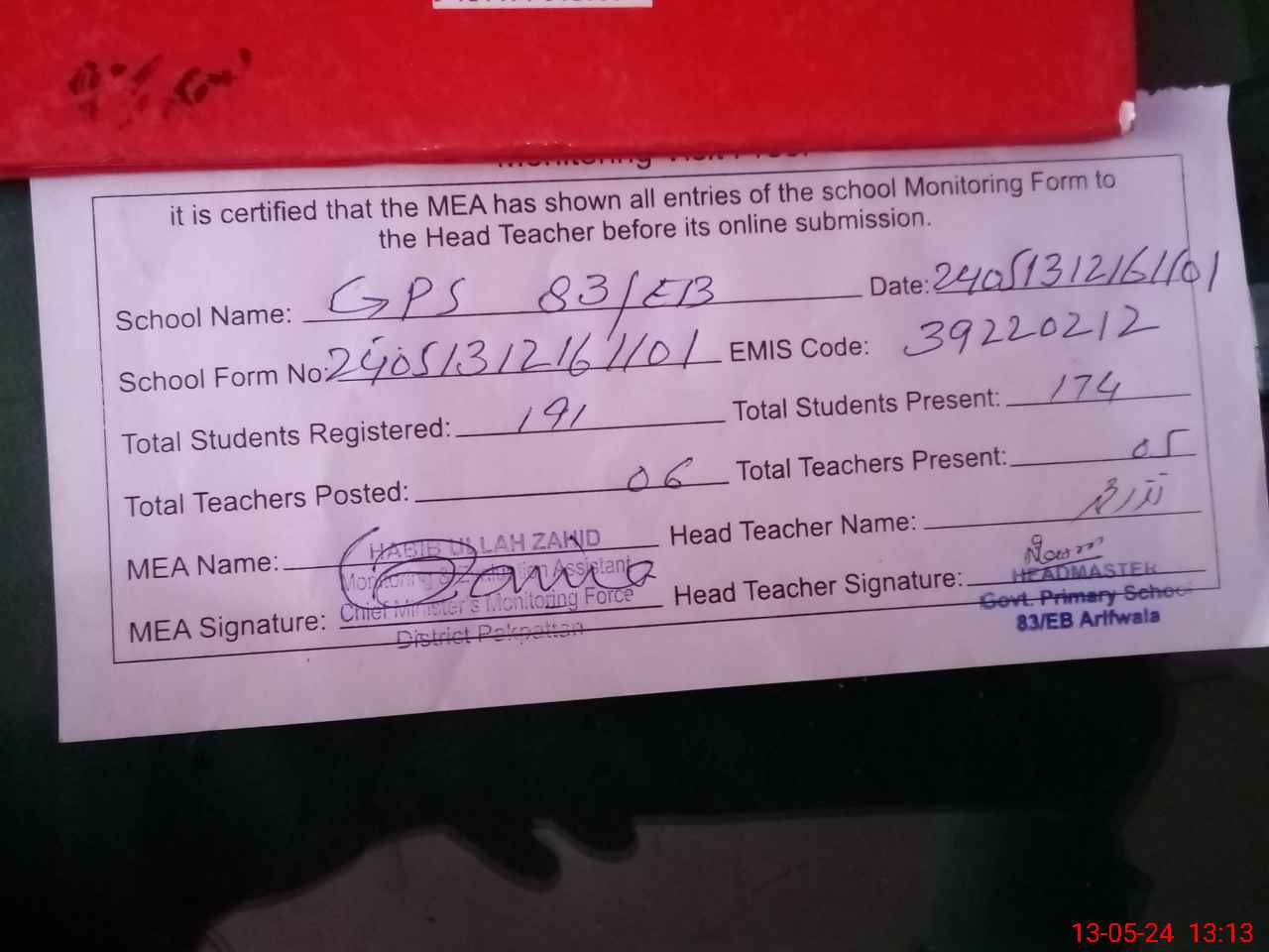 | Attendance Register | Head Teacher | MEA with School | Visit Proof |