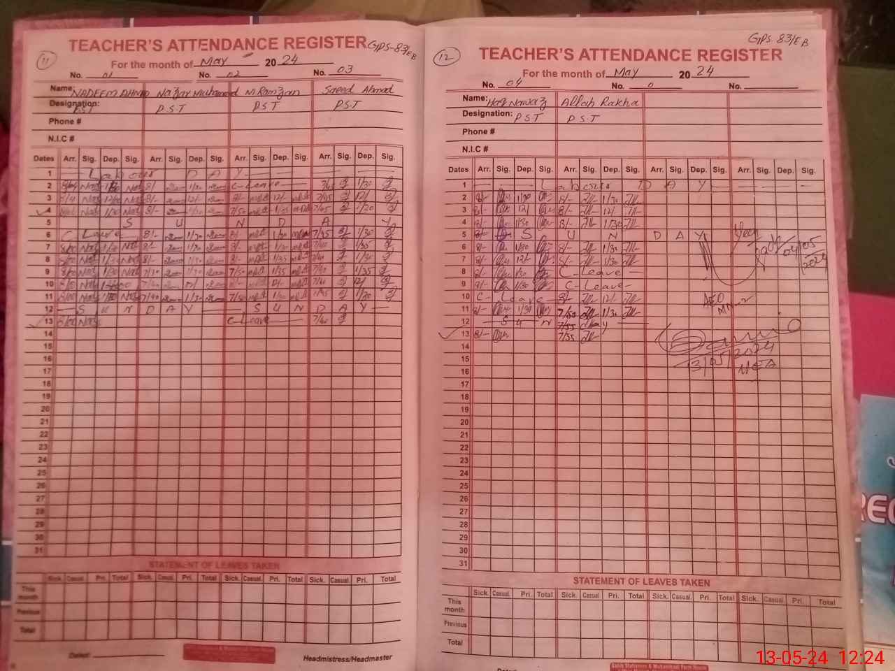 | CNIC | Full Name | Designation | R/C | Absence During Last Calender Month |