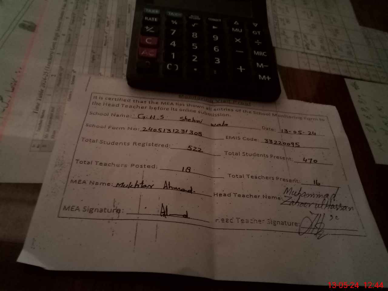 | Attendance Register | Head Teacher | MEA with School | Visit Proof |