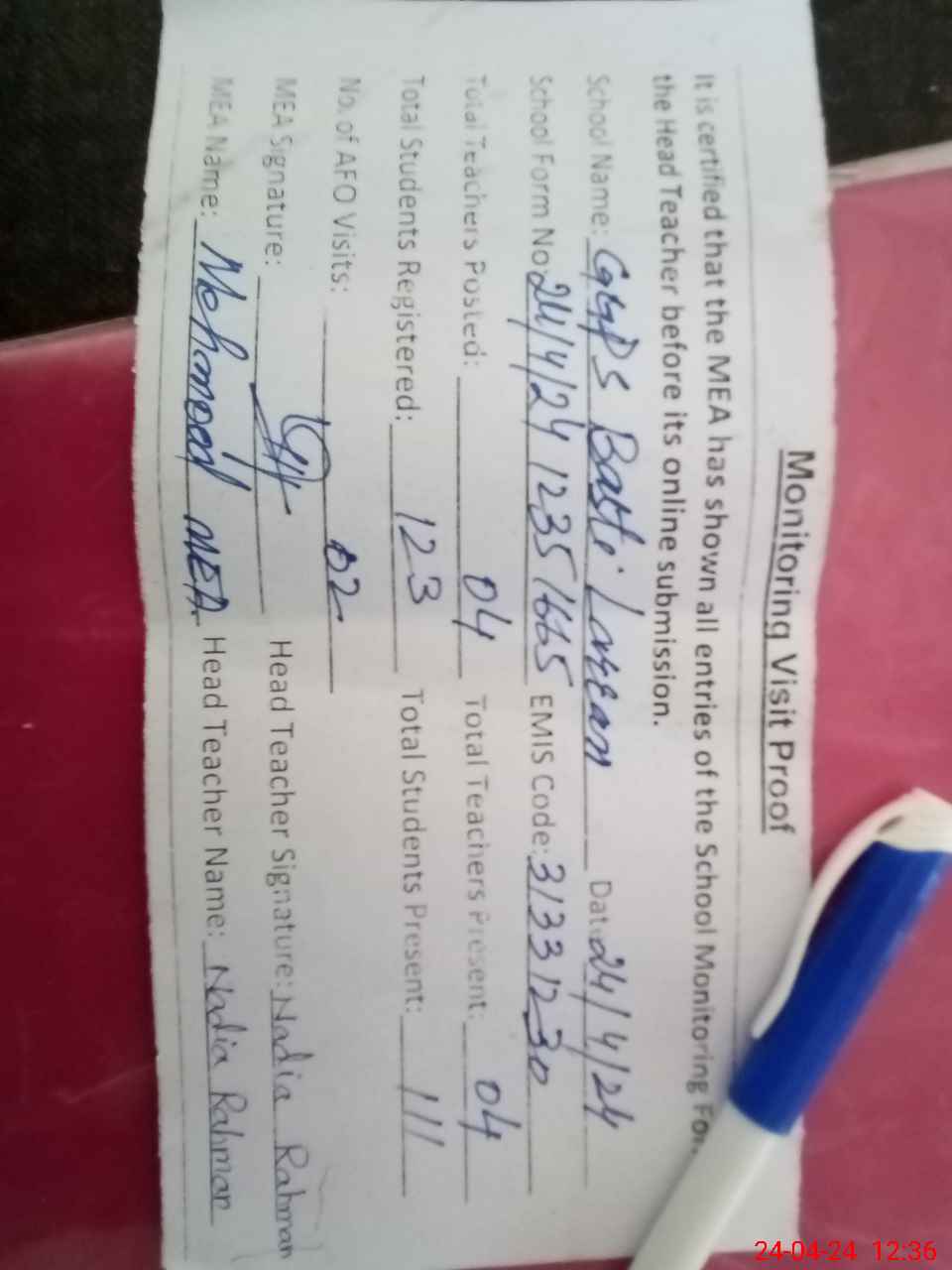 | Attendance Register | Head Teacher | MEA with School | Visit Proof |