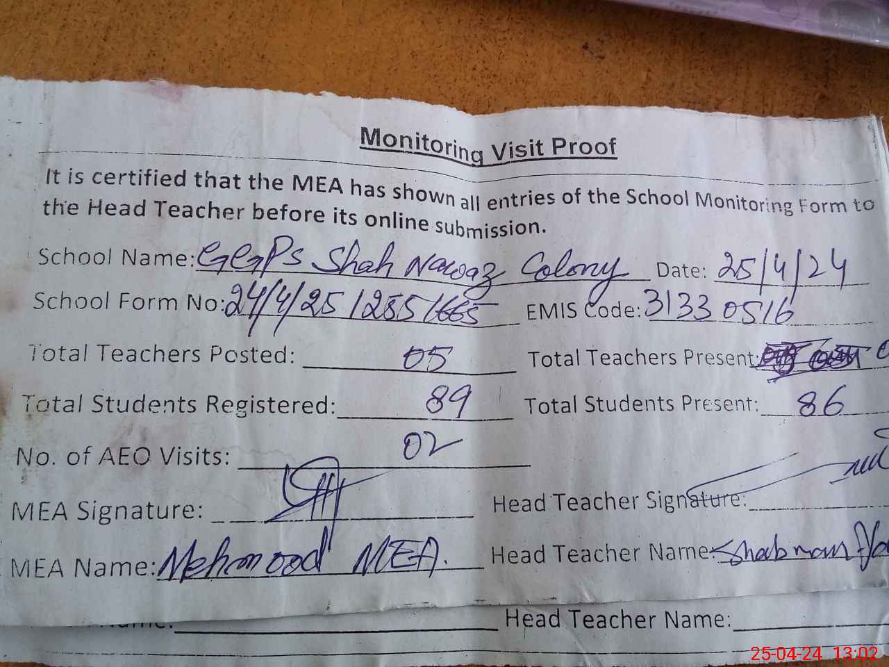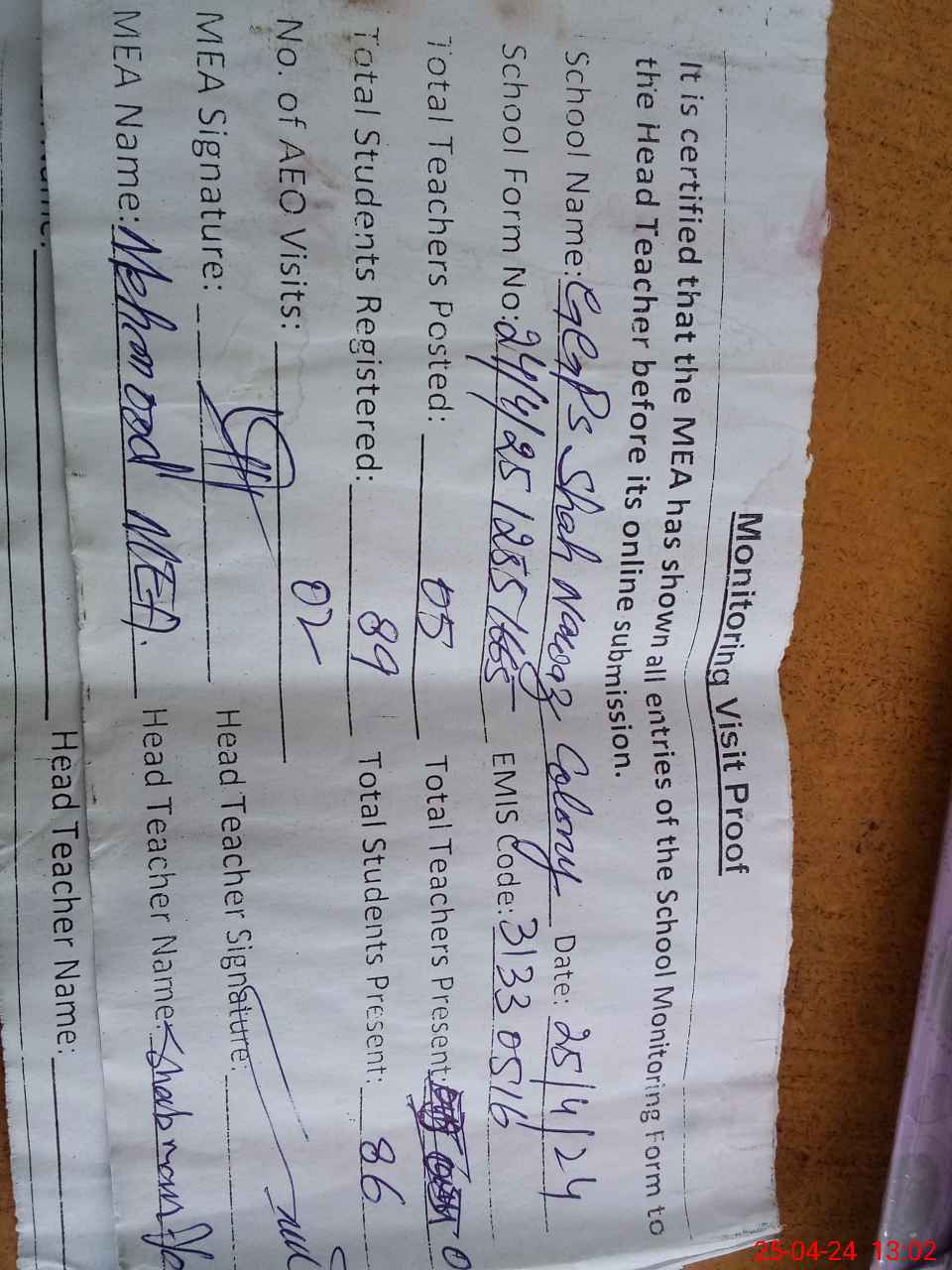 | Attendance Register | Head Teacher | MEA with School | Visit Proof |