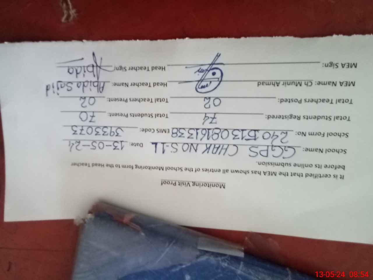 | Attendance Register | Head Teacher | MEA with School | Visit Proof |