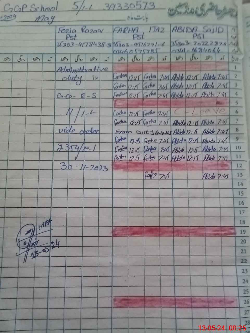 | CNIC | Full Name | Designation | R/C | Absence During Last Calender Month |