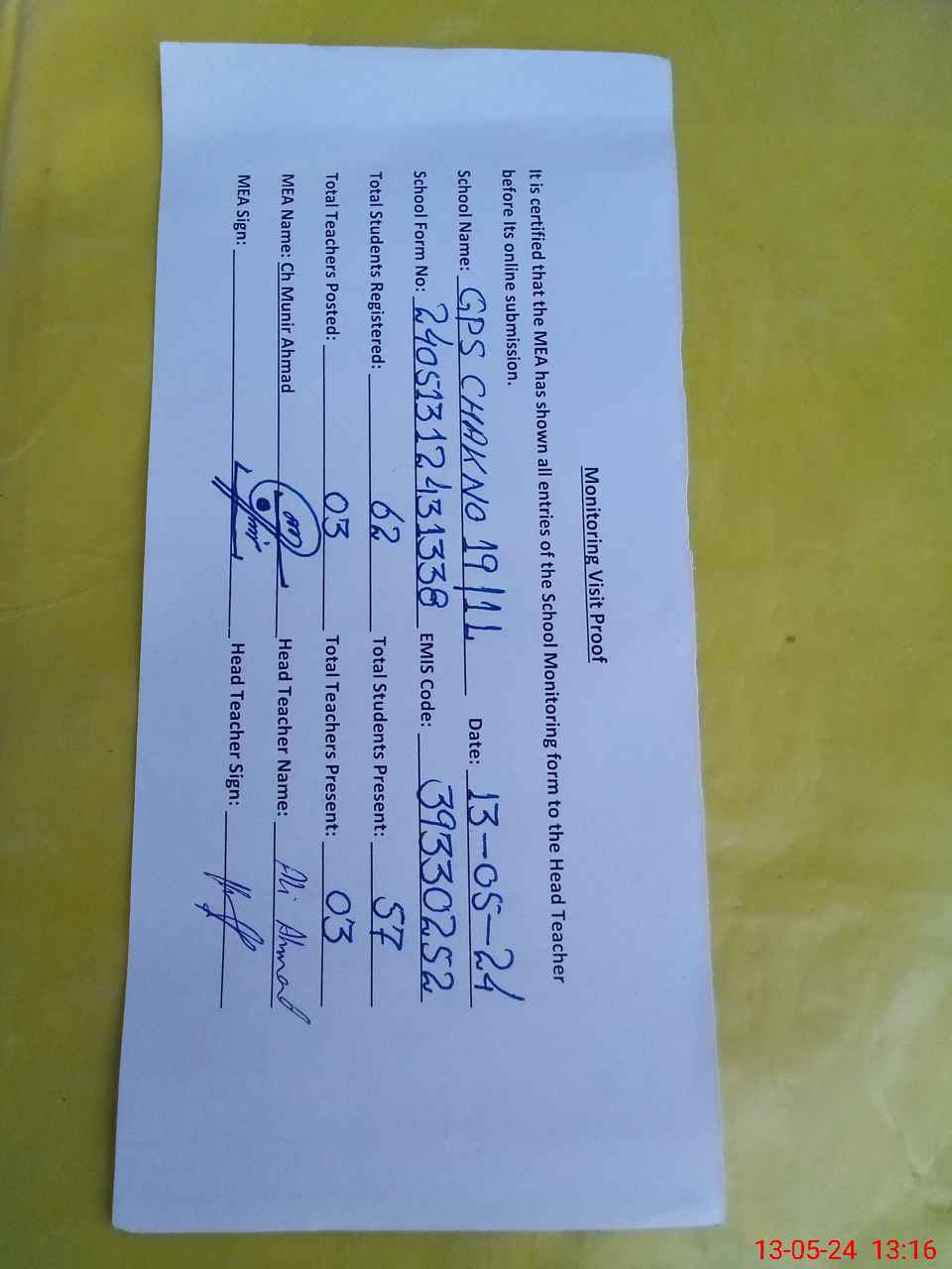 | Attendance Register | Head Teacher | MEA with School | Visit Proof |
