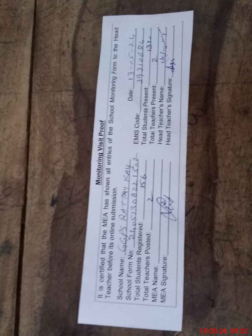 | Attendance Register | Head Teacher | MEA with School | Visit Proof |