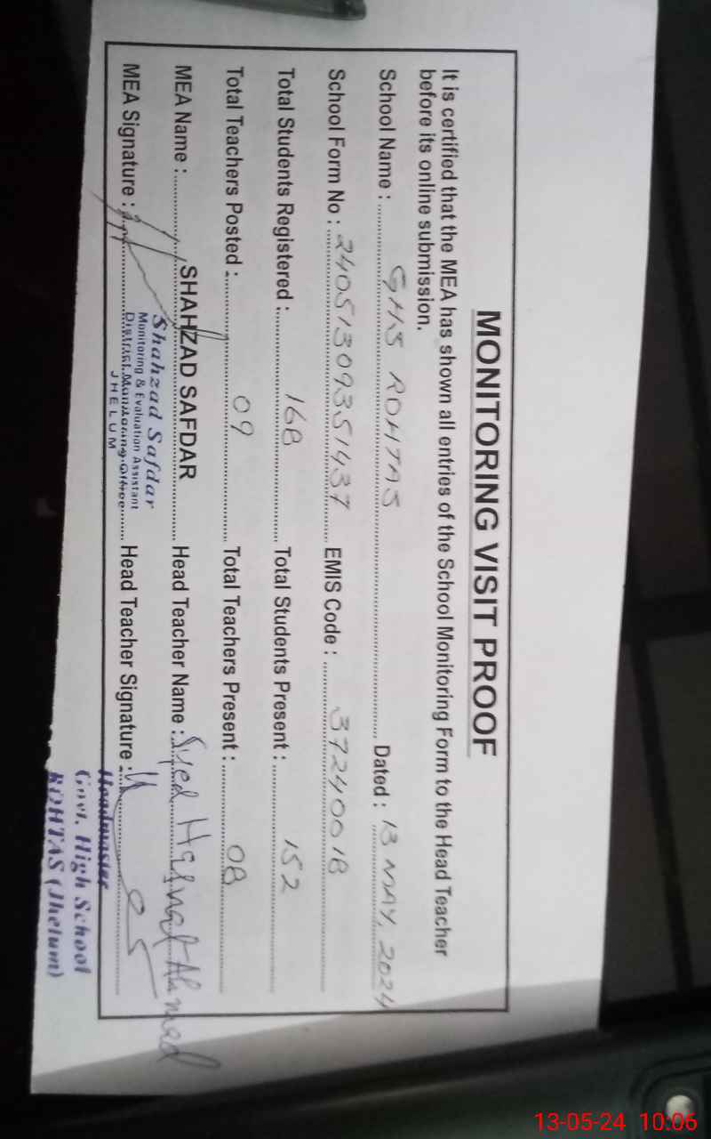 | EMIS Code: 37240018 | Name of School: GHS ROHTAS | |||