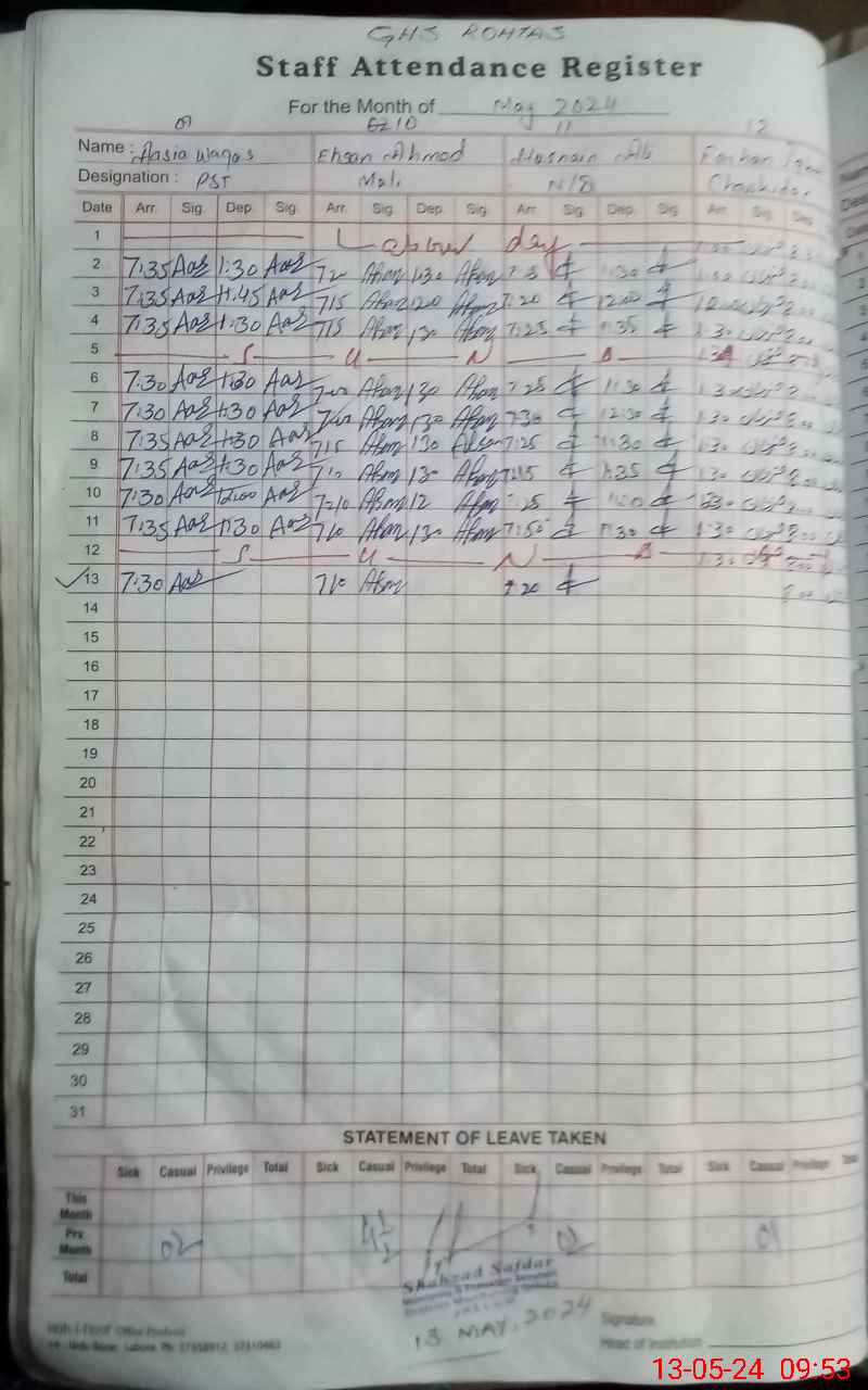 | CNIC | Full Name | Designation | R/C | Absence During Last Calender Month |
