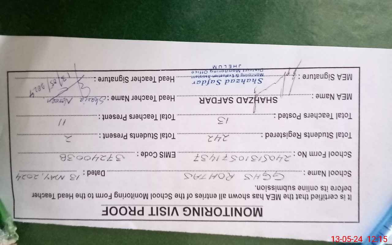 | EMIS Code: 37240038 | Name of School: GGHS ROHTAS | |||
