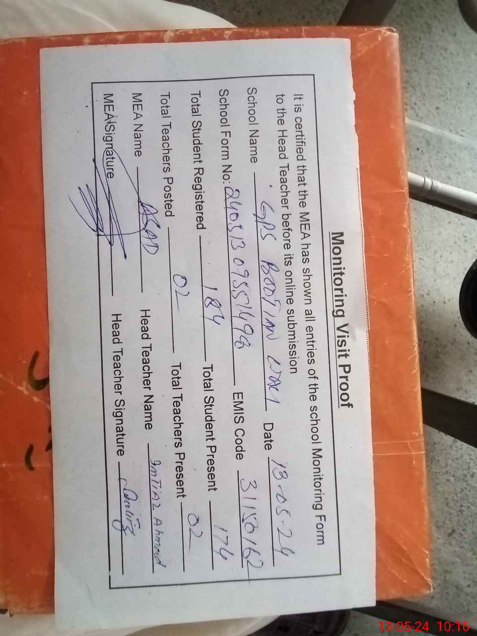 | Attendance Register | Head Teacher | MEA with School | Visit Proof |