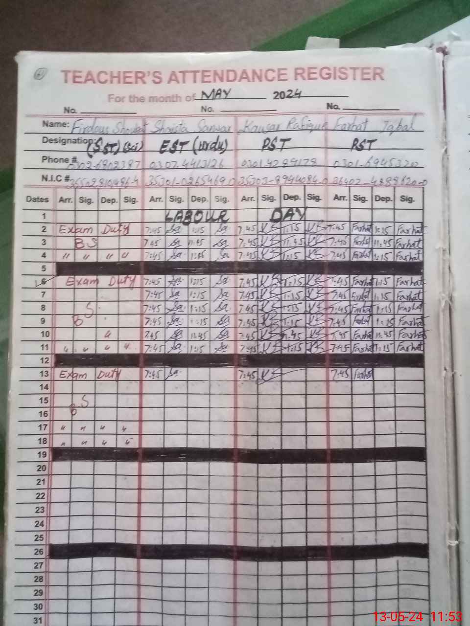 | CNIC | Full Name | Designation | R/C | Absence During Last Calender Month |