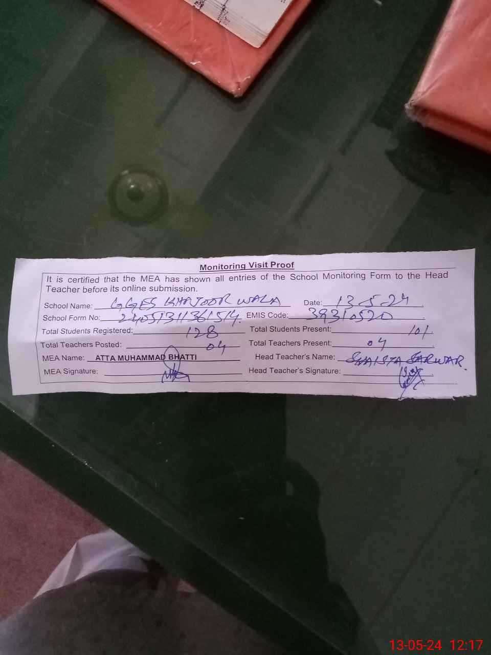 | Attendance Register | Head Teacher | MEA with School | Visit Proof |