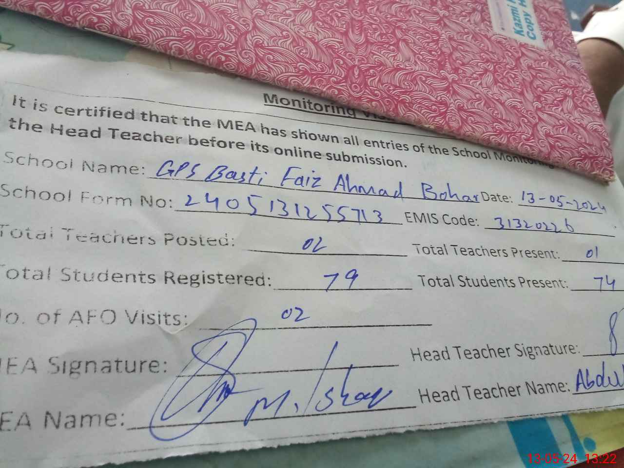 | Attendance Register | Head Teacher | MEA with School | Visit Proof |