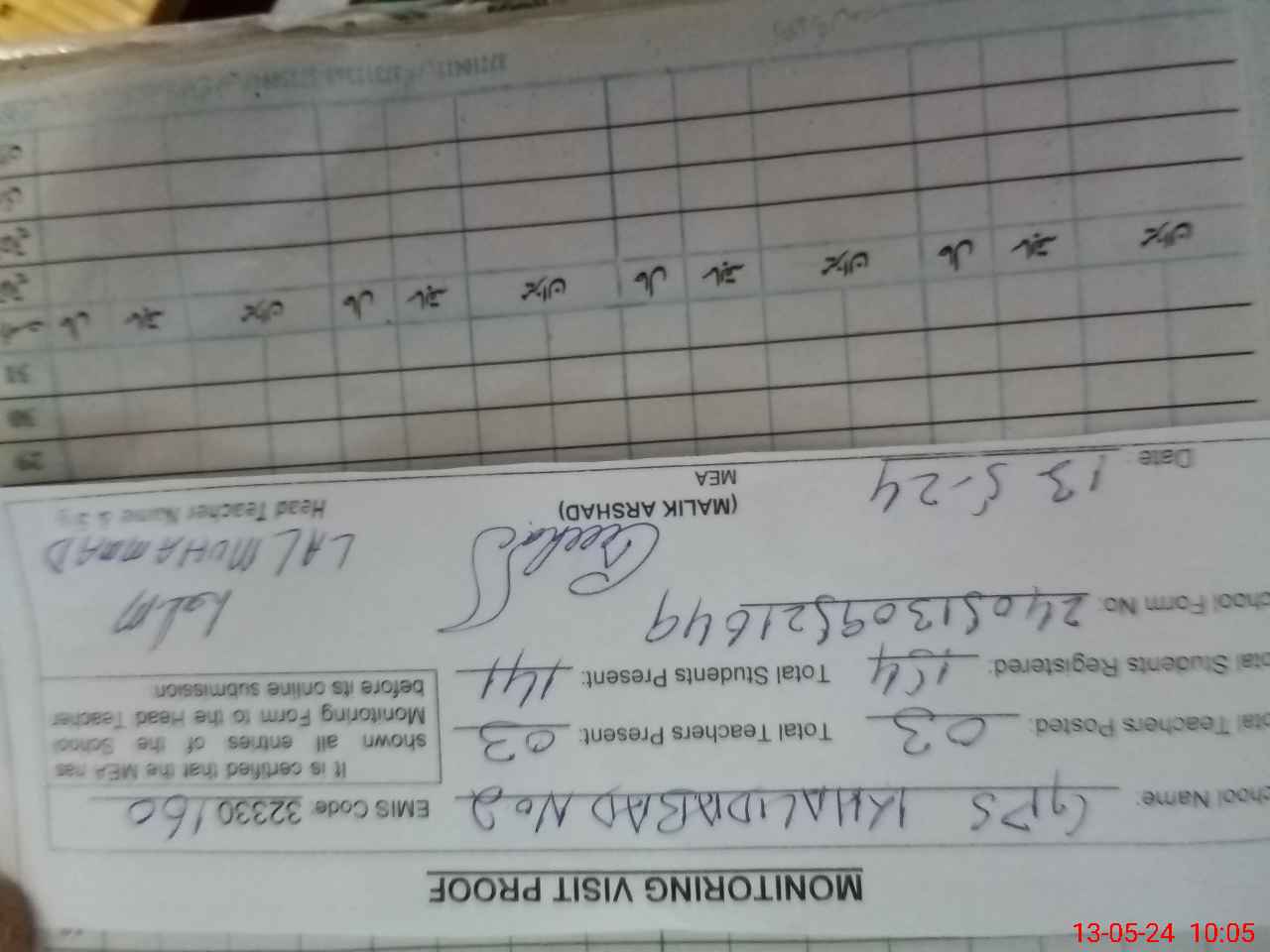 | Attendance Register | Head Teacher | MEA with School | Visit Proof |