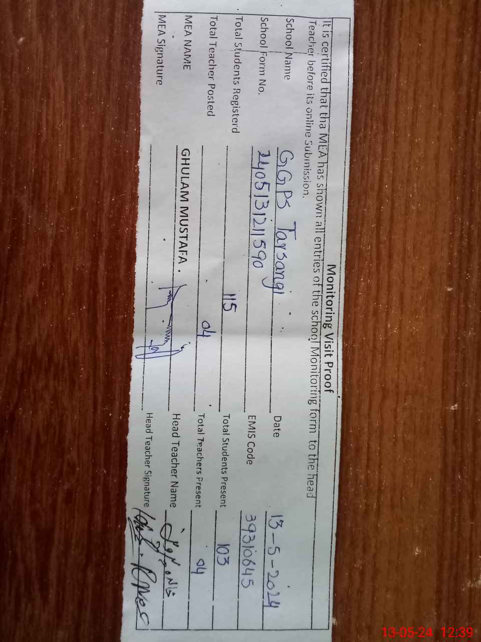 | Attendance Register | Head Teacher | MEA with School | Visit Proof |
