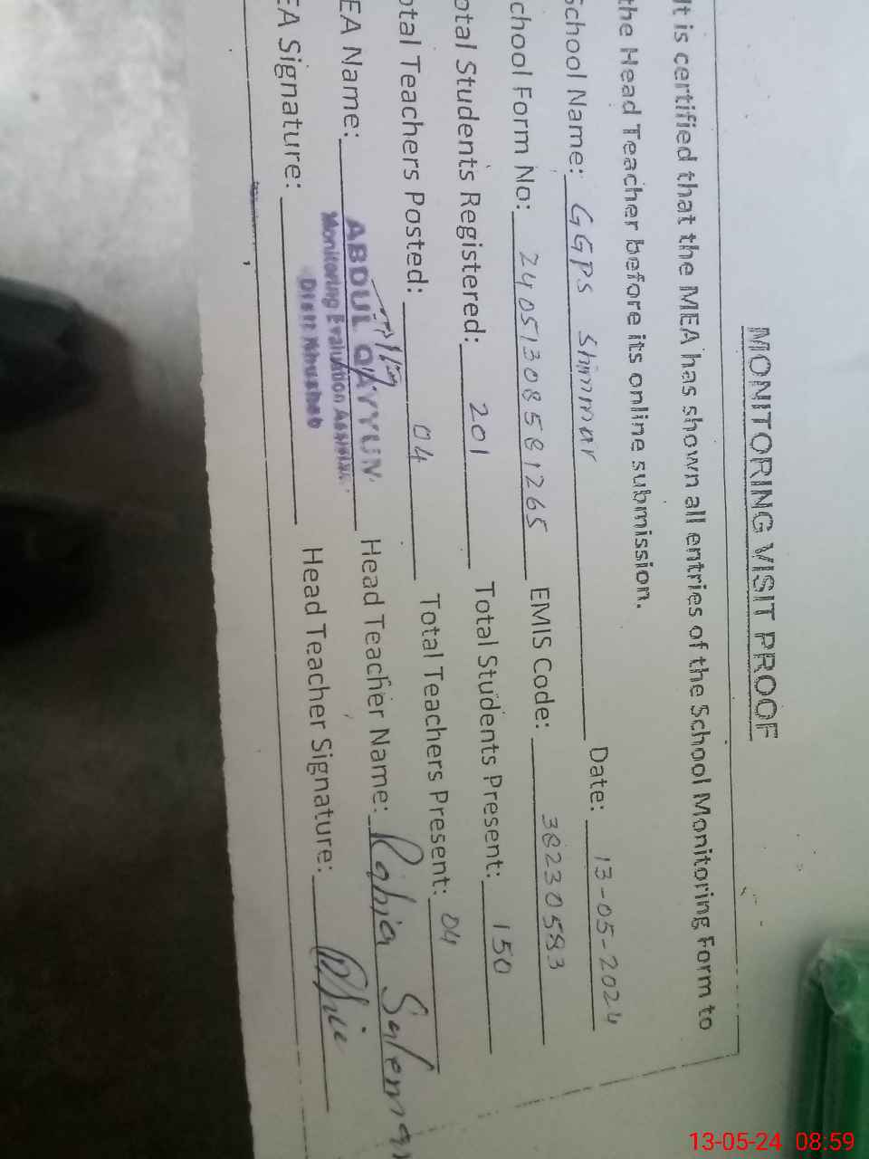 | Attendance Register | Head Teacher | MEA with School | Visit Proof |