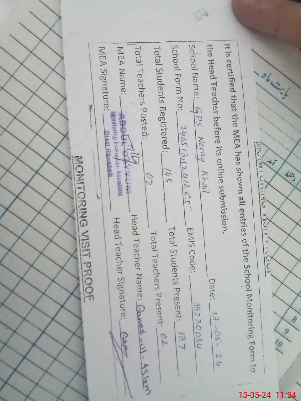 | Attendance Register | Head Teacher | MEA with School | Visit Proof |