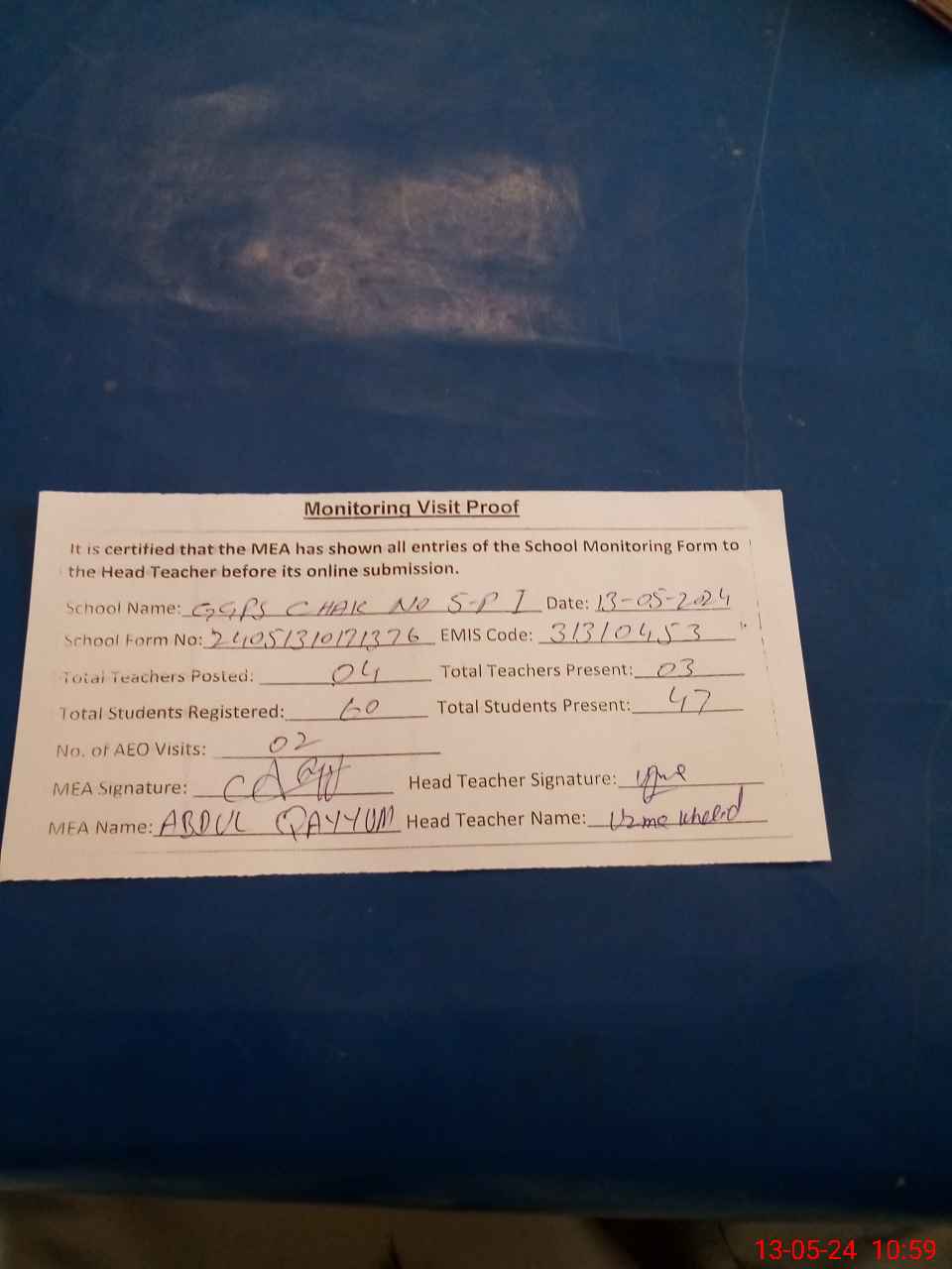 | Attendance Register | Head Teacher | MEA with School | Visit Proof |