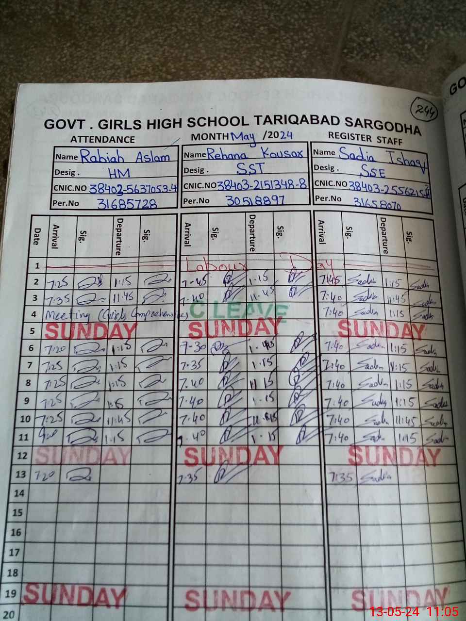 | CNIC | Full Name | Designation | R/C | Absence During Last Calender Month |
