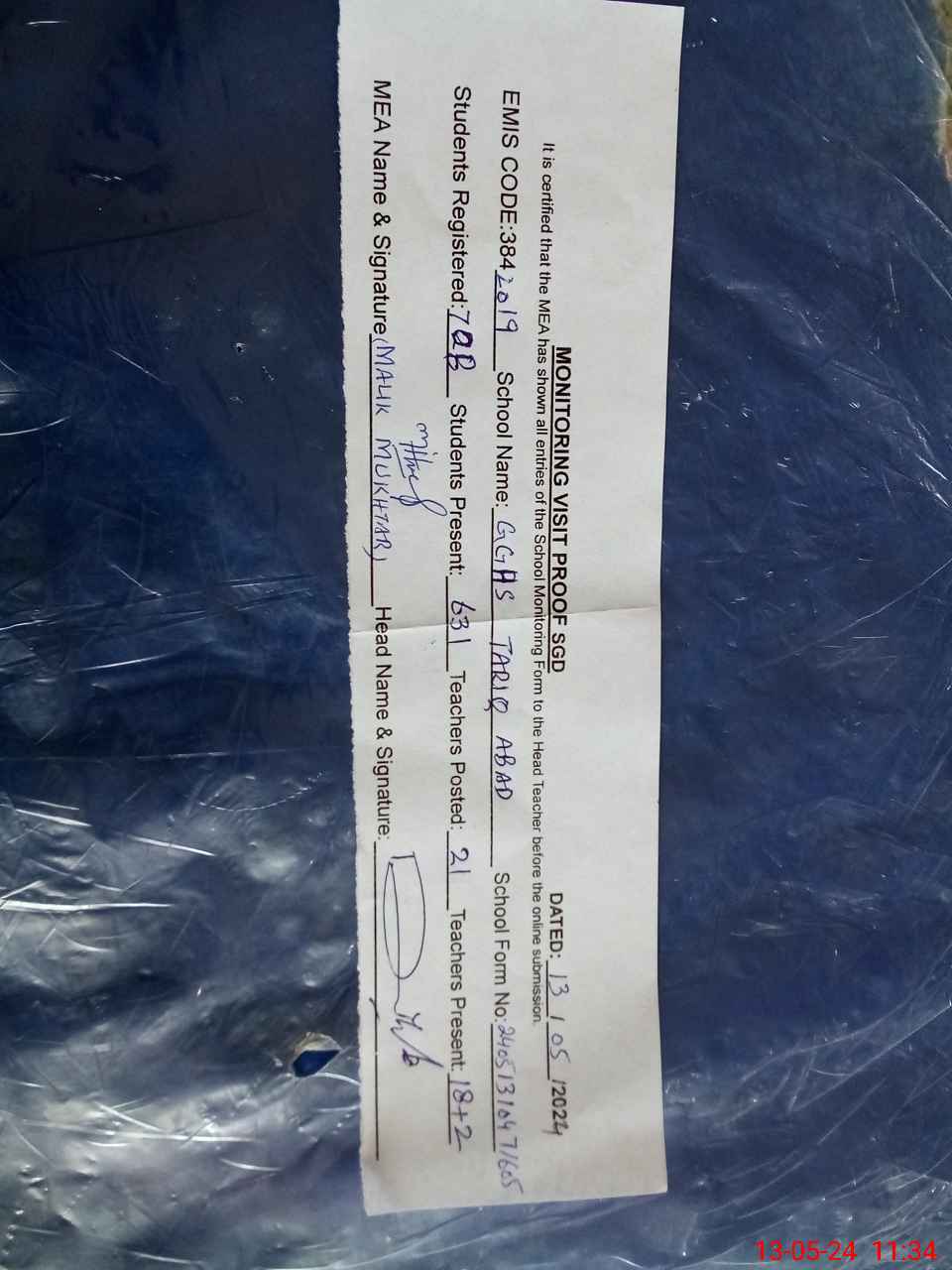 | Attendance Register | Head Teacher | MEA with School | Visit Proof |