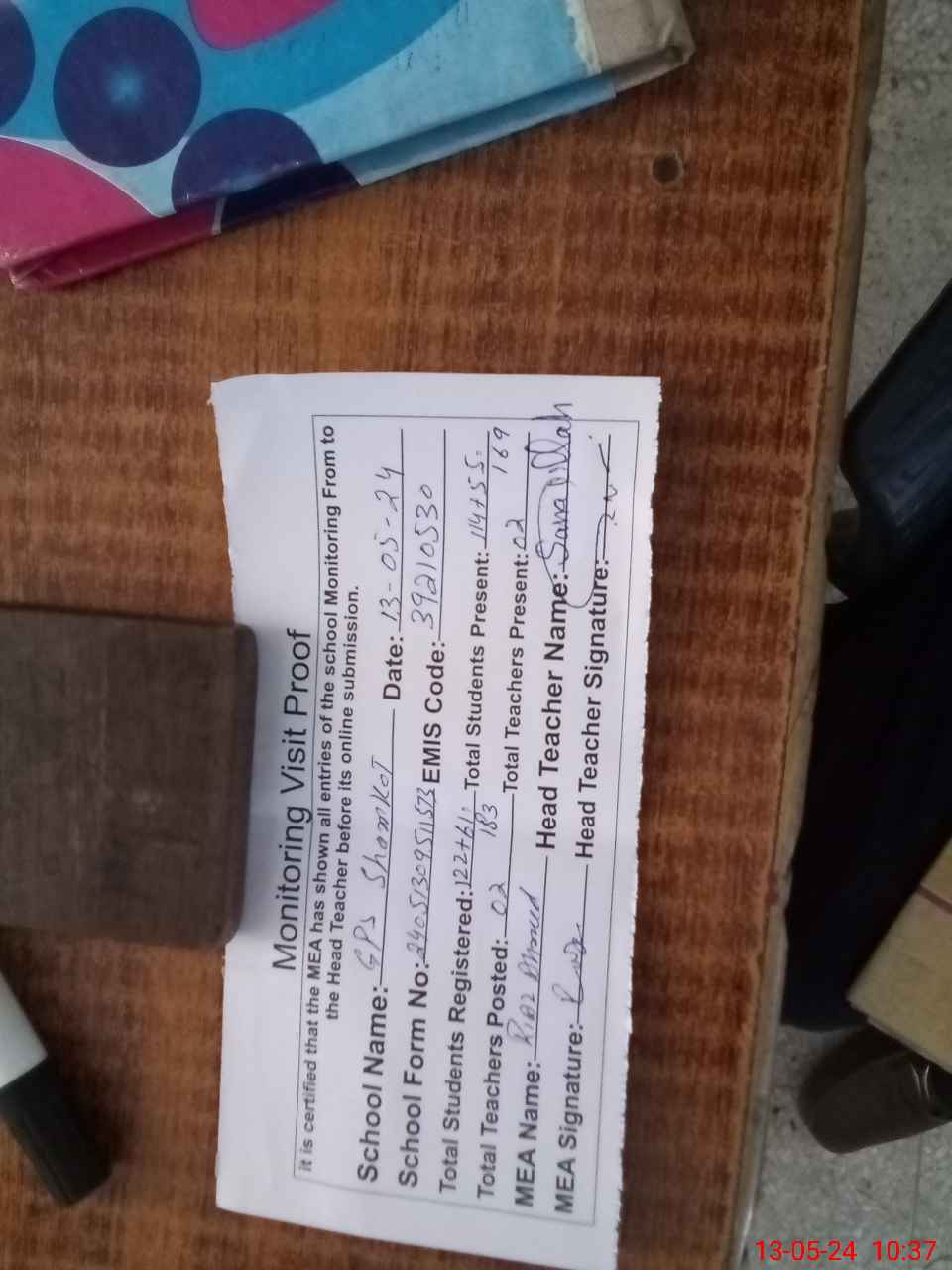 | Attendance Register | Head Teacher | MEA with School | Visit Proof |