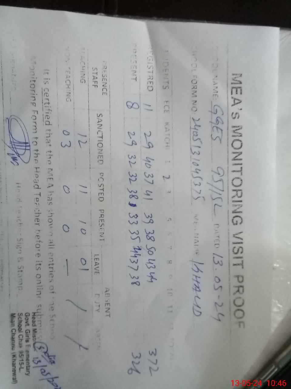 | Certified that this School was Inspected by the Undersigned MEA/DMO Today and the Information Stated Above is as Per Record. | |||||