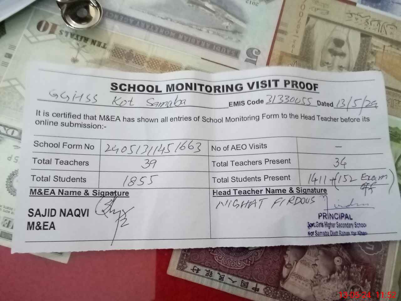 | Attendance Register | Head Teacher | MEA with School | Visit Proof |