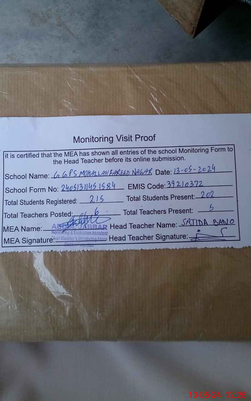 | EMIS Code: 39210372 | Name of School: GGPS MOHALLAH FAREED NAGAR | |||