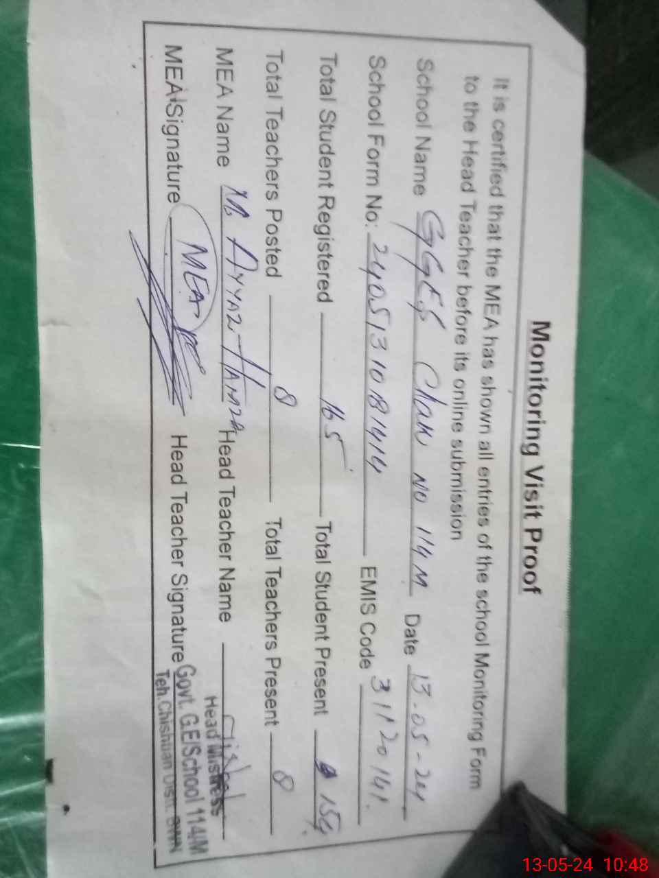 | Certified that this School was Inspected by the Undersigned MEA/DMO Today and the Information Stated Above is as Per Record. | |||||