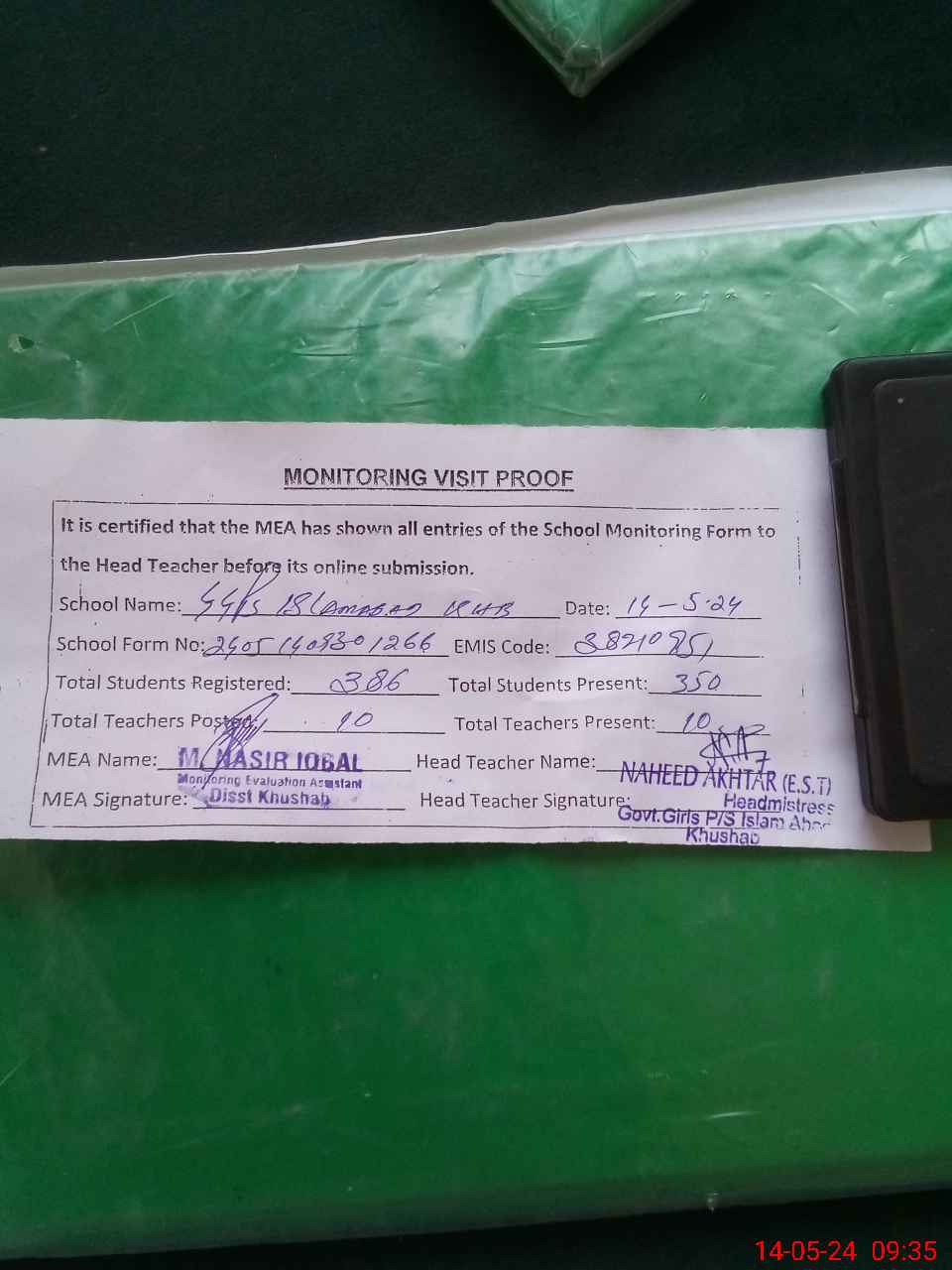 | EMIS Code: 38210951 | Name of School: GGPS ISLAM ABAD KHUSHAB | |||