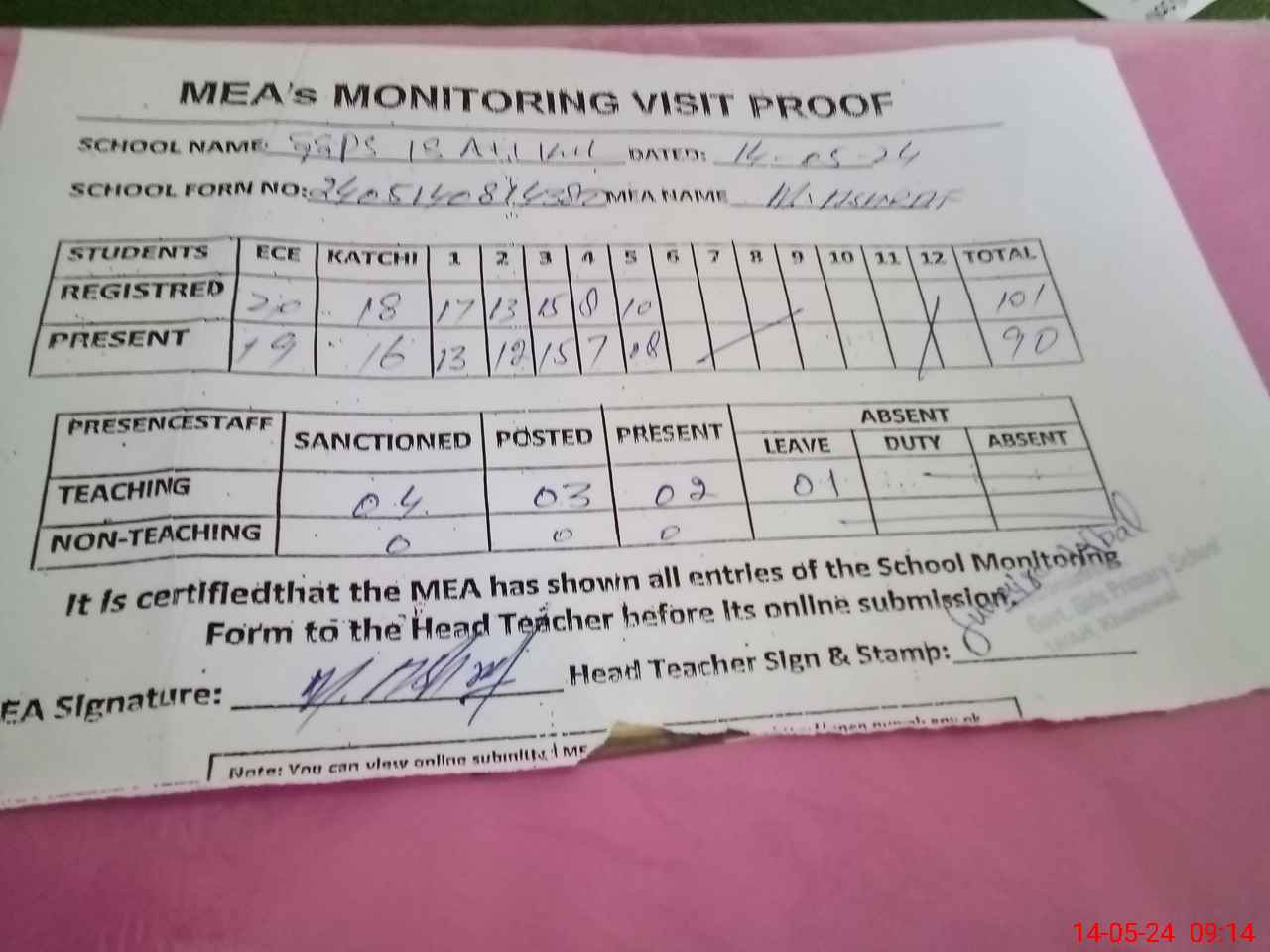 | Attendance Register | Head Teacher | MEA with School | Visit Proof |