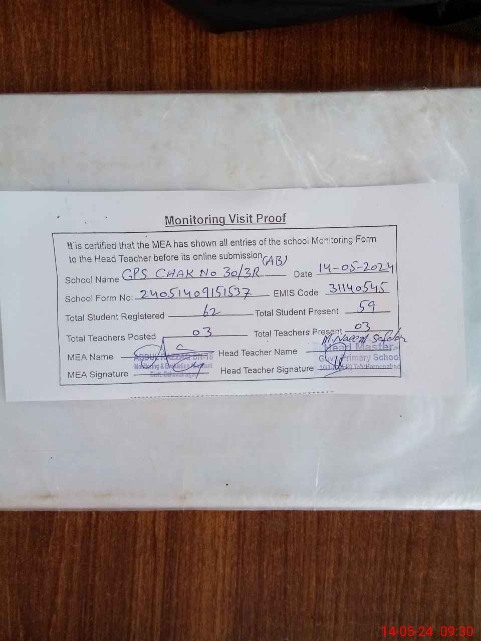| Attendance Register | Head Teacher | MEA with School | Visit Proof |