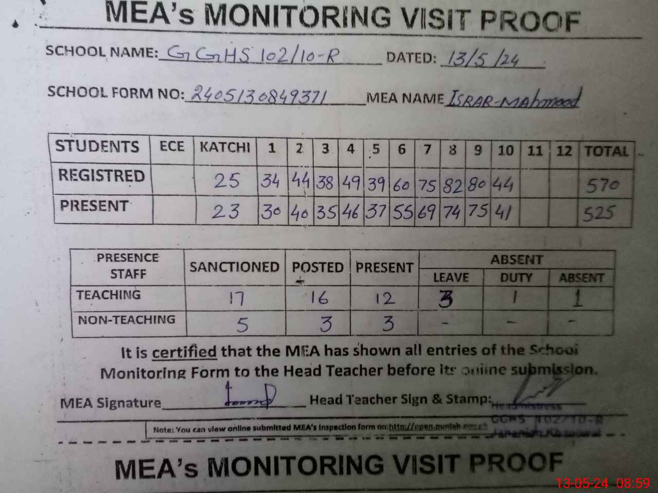 | Attendance Register | Head Teacher | MEA with School | Visit Proof |